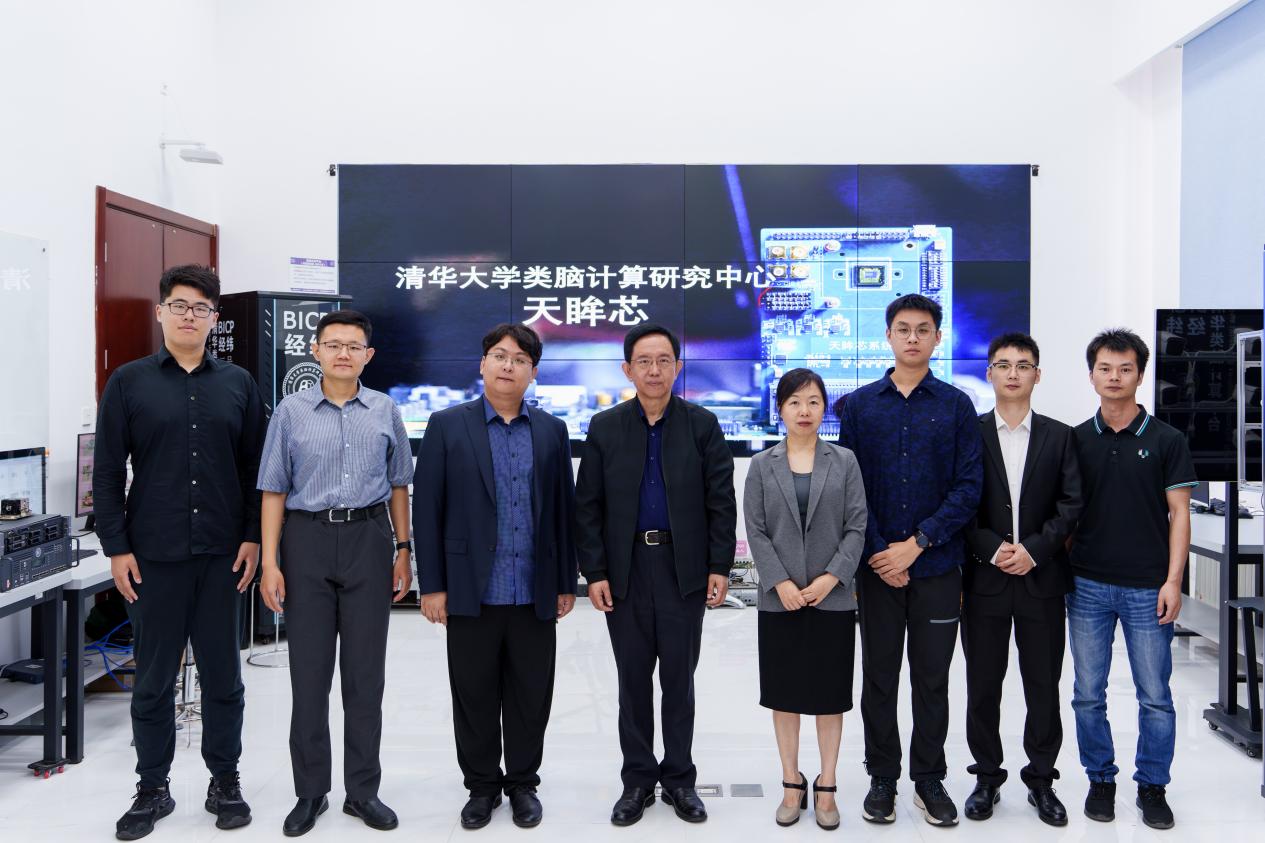 “天眸芯”团队合照,从左到右依次为:精仪系2022级博士生陈雨过、2020级博士生王韬毅、2017级博士生杨哲宇,精仪系教授施路平、教授赵蓉,精仪系2020级博士生林逸晗、2020级博士生曾辉,类脑计算研究中心工程师王佳政。