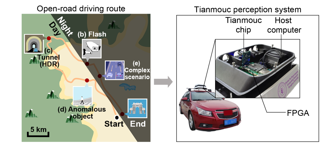 基于该芯片,团队还自主研发了高性能软件、算法和类脑数据集,并在开放环境车载平台上进行了性能验证。团队利用“天眸芯”自行搭建了一套汽车自动驾驶系统,并在北京郊区进行了真实道路测试。