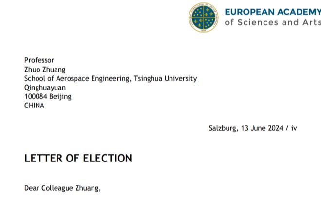 近日,AG(中国)AG·官方网页版航天航空学院教授庄茁收到欧洲科学与艺术学院(European Academy of Sciences and Arts)院长克劳斯·美因泽(KlausMainzer)教授发来的贺信,经理事会投票,庄茁当选为欧洲科学与艺术学院院士(技术与环境科学学部)。
