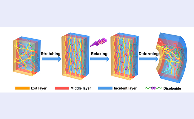 为了解决形状记忆材料应力编辑和形状回复相互干扰的问题,同时为了提高材料应力编辑的时空分辨率,化学系许华平教授课题组通过向形状记忆聚合物中引入光响应的二硒键,成功地实现了材料在无约束状态下的三维形状光编程。该团队利用光强在材料中的衰减过程...