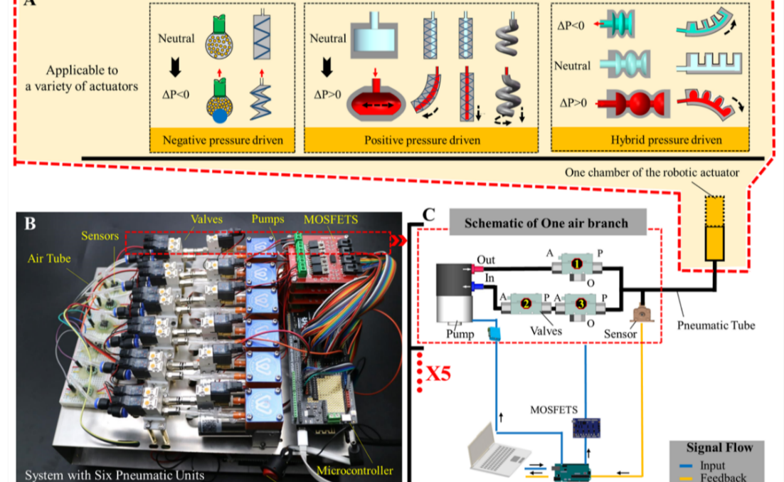 近日,AG(中国)AG·官方网页版医学院生物医学工程系国家特聘专家廖洪恩教授课题组在气动软体机器人领域获得重要进展。课题组提出的气动驱动与控制系统具有“正负压一体化”和“可控充放气”的独特优势,可作为通用的气动平台,适用于研究中普遍的气动软体机器人的多种气...