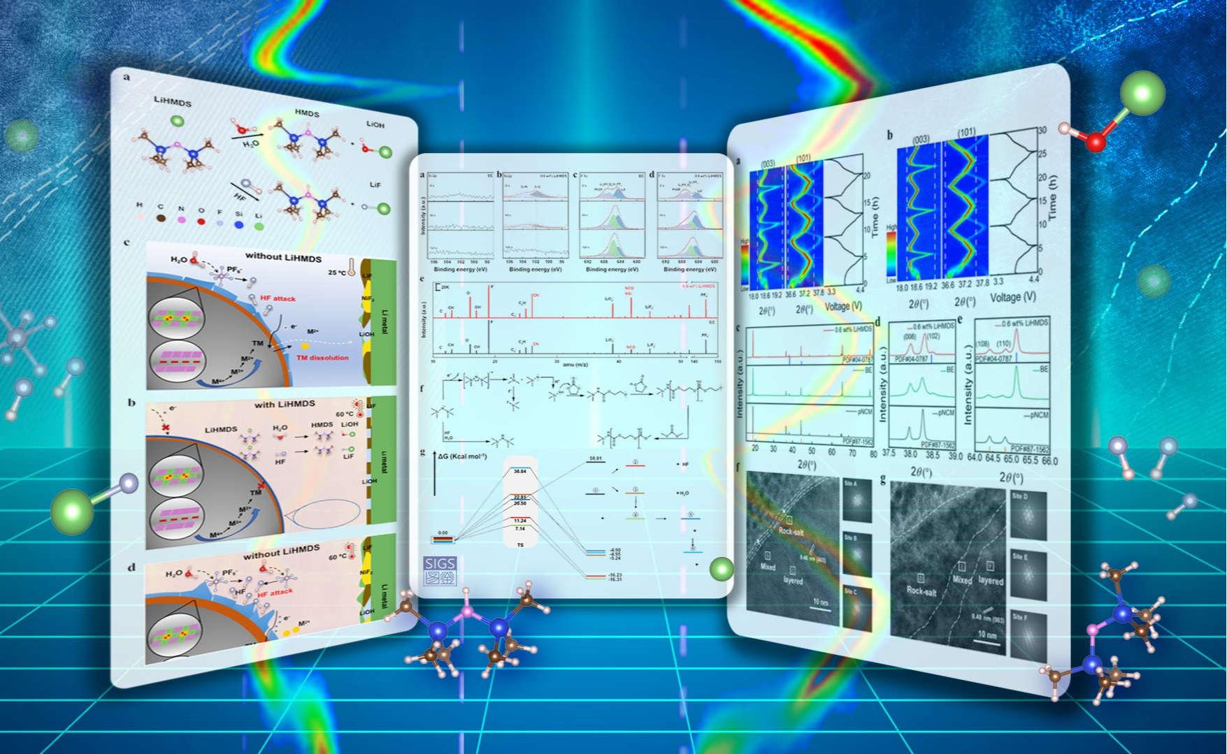 近日,AG(中国)AG·官方网页版深圳国际研究生院贺艳兵课题组开发了一种多功能的六甲基二硅胺基锂(LiHMDS)电解液添加剂,发现在典型的含氟碳酸酯非水电解液中仅添加0.6wt%的LiHMDS,就能使Li||LiNi0.8Co0.1Mn0.1O2(NCM811)电池在25°C−60°C温度范围和4.5V高截止电压下稳...