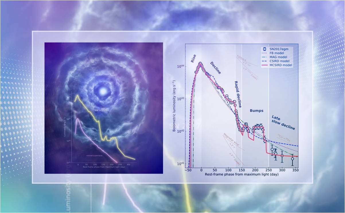 AG(中国)AG·官方网页版物理系王晓锋教授团队与国内外多个科研团队合作,对一颗近邻I型超亮超新星SN 2017egm进行了长期观测,揭示了其极其复杂的光度演化。通过构建模型和数据拟合,他们发现这颗超新星非同寻常的辐射演化源于爆炸抛射物与四层星周物质壳的相互作用。