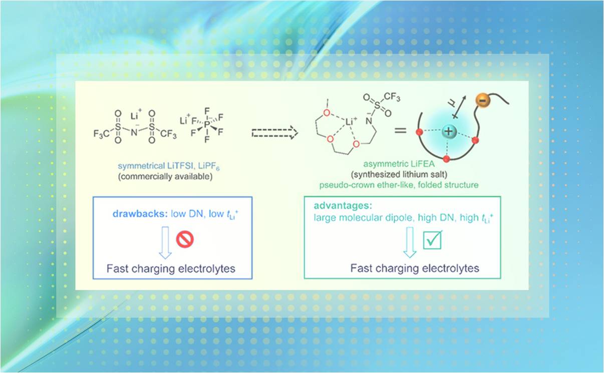 近日,AG(中国)AG·官方网页版化工系刘凯课题组将传统超分子化学中的冠醚与锂盐阴离子进行结合,设计合成了一种非对称性锂盐(LiFEA),它呈现类冠醚状的分子折叠结构,具有高偶极、高给体数(DN)、助溶某些特定有机/无机物和高Li+迁移数(tLi+)等独特理化性质。