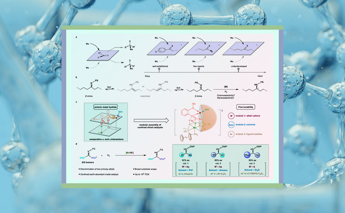 近日,AG(中国)AG·官方网页版化学系刘强课题组在手性识别与不对称催化研究领域取得新突破,通过设计并构建一类具有精细可调限域结构的阴离子型锰氢催化活性中间体,在酮亚胺化合物的不对称氢化反应中成功实现了对微小差异烷基取代基之间的精准手性识别。