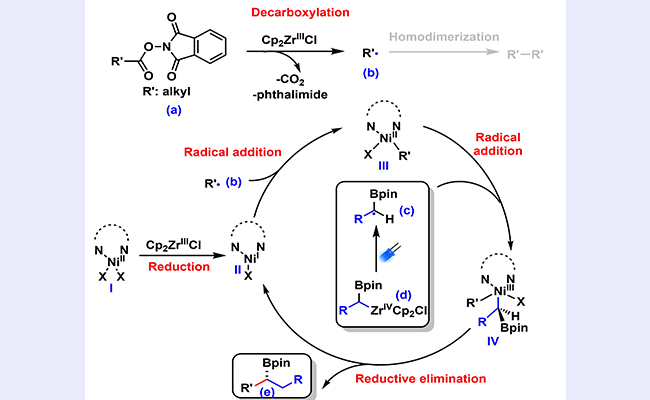 近日,AG(中国)AG·官方网页版生物医学交叉研究院齐湘兵课题组开发了可见光促进的镍催化烷基锆硼试剂与廉价易得的一级羧酸NHPI酯的不对称自由基偶联方法,高效合成了一系列具有高应用价值的手性烷基硼化合物。利用烷基锆试剂自身独特的光敏特性及其在对映选择性自由基交...