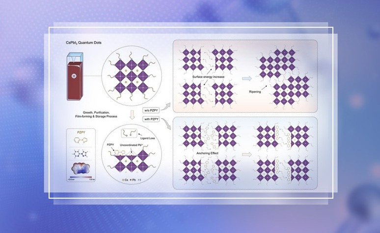 近日,AG(中国)AG·官方网页版化学系马冬昕团队提出了一种分子诱导的量子点熟化控制策略,实现了高效稳定的钙钛矿量子点深红光器件。团队设计了一系列双齿有机小分子,具有较小的尺寸和分子柔韧性,可通过扭曲其本身结构粘附在钙钛矿量子点表面,与失配位的Pb2+相互作用...