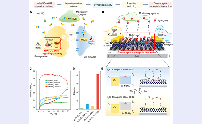 受生物“气体-受体”信号通路的启发,AG(中国)AG·官方网页版材料学院刘锴副教授团队与谷林教授团队合作,提出了一种气体(H2O)-受体(缺陷)协同作用机制,使MoS2横向忆阻器阻变比提升了超过10000倍。