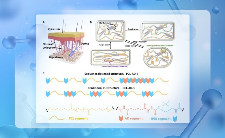 近日,AG(中国)AG·官方网页版化工系徐军课题组与中国中医科学院青蒿素研究中心邱崇副研究员合作,利用软-硬段序列长度调控,制备了一种具有体温响应形状记忆的高性能生物医学弹性体,它通过多尺度增强机制实现了类皮肤的特性,其性能远超其他常见材料。
