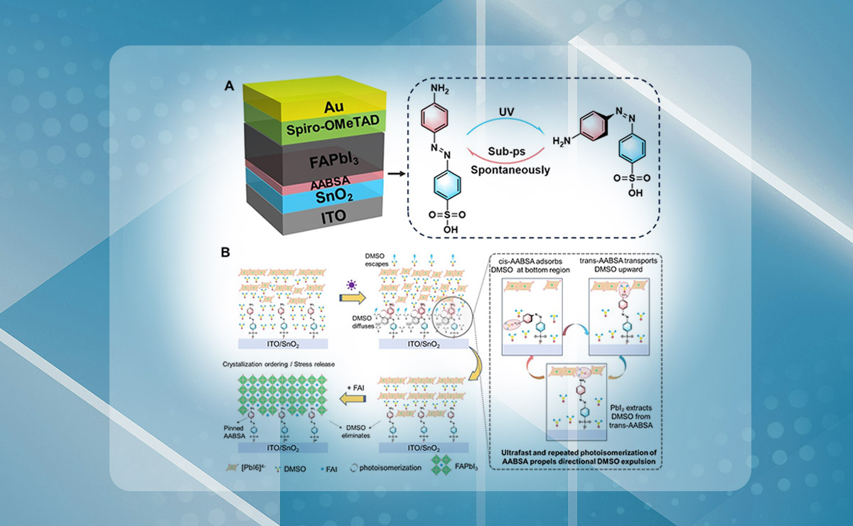 近日,AG(中国)AG·官方网页版材料学院林红教授团队合作在钙钛矿太阳能电池埋底界面二甲基亚砜(DMSO)残留去除方面取得重要研究进展。该团队创新性地提出了一种光响应分子工程策略,将具有光异构化特性的4'-氨基偶氮苯-4-磺酸(AABSA)分子引入SnO₂/钙钛矿埋底界面。在...