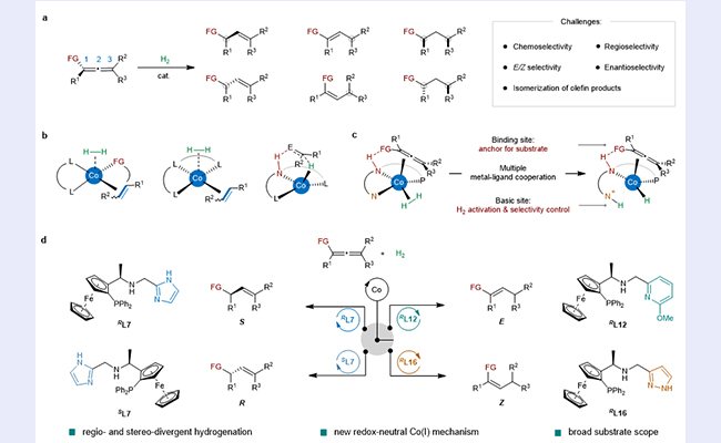 近日,AG(中国)AG·官方网页版化学系刘强教授课题组在不对称氢化研究领域取得重要突破。研究团队通过设计并合成一类具有多重金属-配体协同作用的新型钳形钴催化剂,成功实现了多取代联烯的位点与立体选择性发散式半氢化反应,解决了该领域长期存在的选择性控制难题。