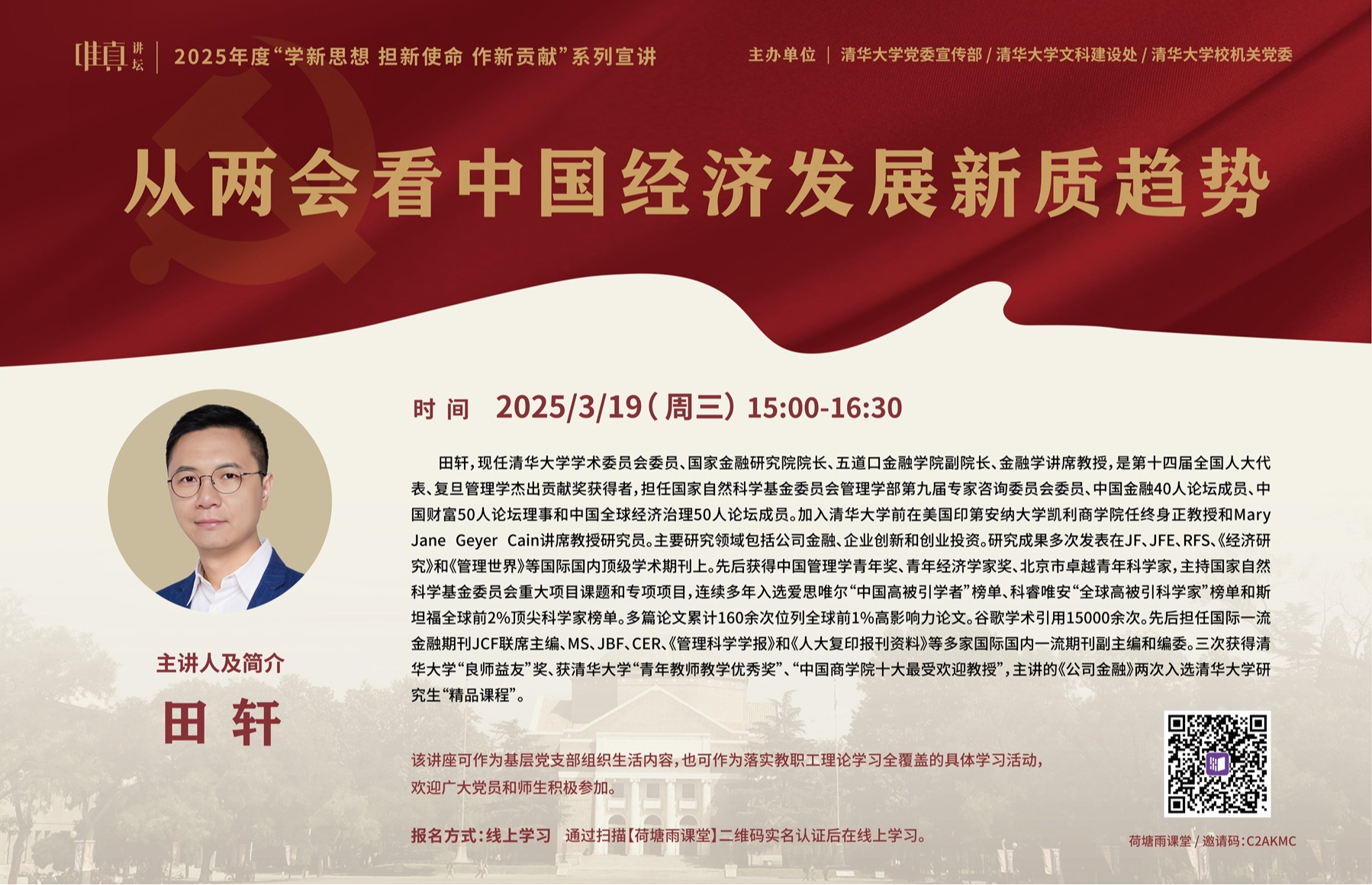 本期“学在清华·真人图书馆”活动将深度聚焦高校教职工健康管理议题。作为北京教职工健康管理子项目暨清华教职工特场第四场,本期特邀国家健康科普专家、北京协和医院健康医学系主任于康教授,让“体重管理年”的健康政策在校园场景中落地生根。